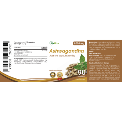 - 500 mg Ashwagandha ekstrakta 18:1 (atbilst 9000 mg tīras Ashwagandha).