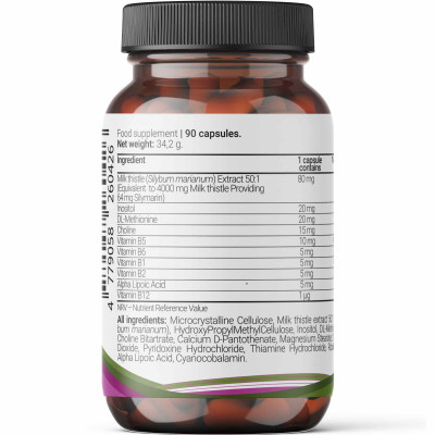 Sastāvdaļas. Palielinātājs: celuloze, mariāna sēklu ekstrakts 50:1, kapsulas apvalks hidroksipropilmetilceluloze, inozīts, DL-metionīns, holīna bitartrāts, kalcija D-pantotenāts, lipinātājs taukskābju magnija sāļi, lipinātājs silīcija dioksīds, lipidoksīna hidrohlorīds, piridoksīna hidrohlorīds, alfa liposkābe, ciānkobalamīns.