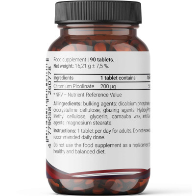 Одна таблетка содержит 200 мкг хрома, что составляет 500 % от рекомендованной суточной нормы (РСН). Хром способствует поддержанию нормального уровня глюкозы в крови и нормальному обмену макроэлементов – углеводов, жиров и белков.