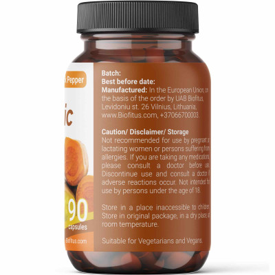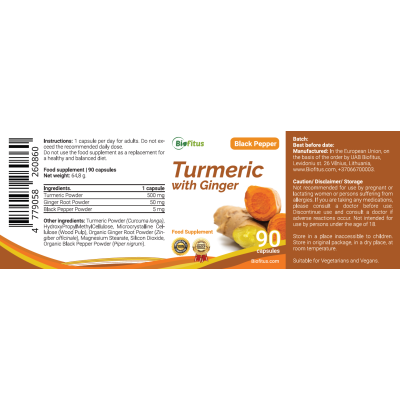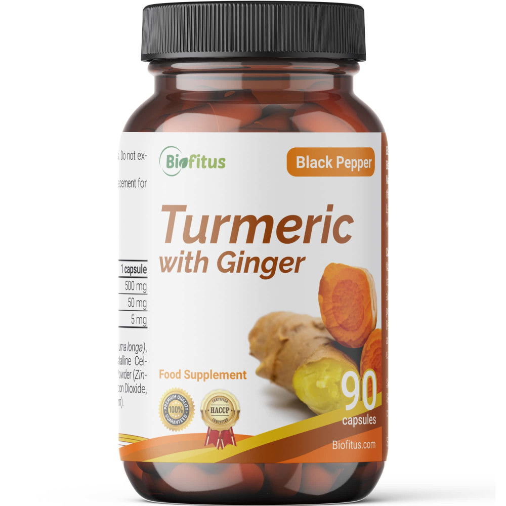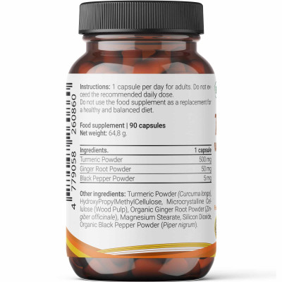 - Каждая капсула содержит 500 мг куркумы и 50 мг имбиря + черный перец.