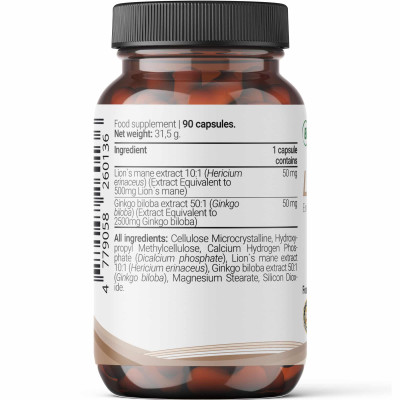 Sastāvdaļas. Celulozes pildviela, hidroksipropilmetilcelulozes kapsulas apvalks, kalcija fosfāta pildviela, Hericium erinaceus (Ežu dižadatene) ekstrakts 10:1, Ginkgo biloba lapu ekstrakts 50:1, pretsalipes viela taukskābju magnija sāļi, pretsalipes viela silīcija dioksīds.
