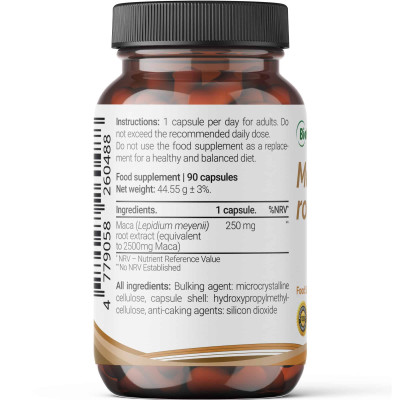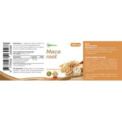 - Makas ekstrakts (10:1) 250 mg atbilst 2500 mg.