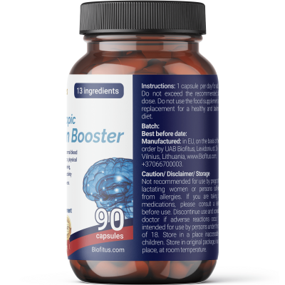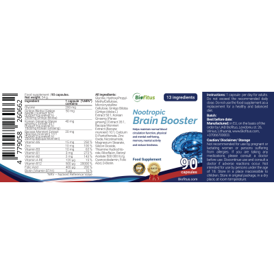 Sastāvdaļas. Glicīns, kapsulas apvalka hidroksipropilmetilceluloze, pildviela celuloze, Ginkgo biloba L. lapu ekstrakts 50:1, Panax žeņšeņa saknes ekstrakts 35:1, Bacopa monnieri garšaugu ekstrakts 10:1, kalcija D-pantotenāts, cinka oksīds, nikotīnamīds, anti-kakings taukskābju magnija sāļi, pretsalipes līdzeklis silīcija dioksīds, tiamīna hidrohlorīds, riboflavīns, retinilacetāts, ciānkobalamīns, pteroilmonoglutamīnskābe, D-biotīns.