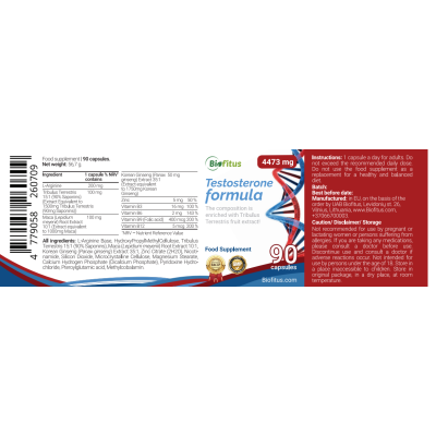 - 100 mg Tribulus Terrestris 15:1 (90% saponīnu) (Ekstrakts, kas atbilst 1500 mg Tribulus Terrestris (90 mg saponīnu))