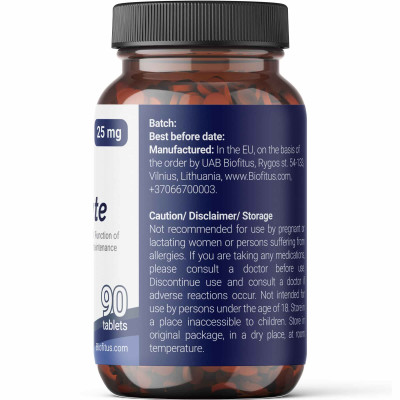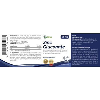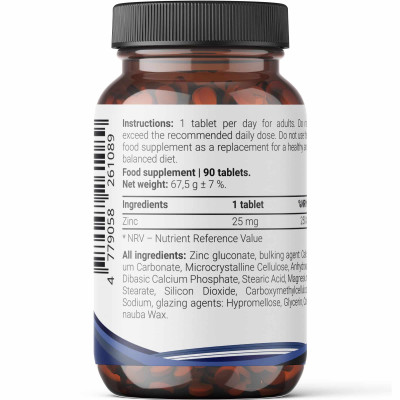 Дозировка цинка: одна таблетка содержит 25 мг цинка (250 % от суточной нормы), поэтому продукт концентрированный и подходит для восполнения ежедневной потребности в цинке.