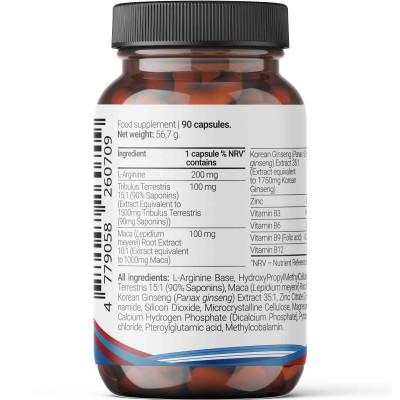 L-arginīna bāze, hidroksipropilmetilceluloze, Tribulus Terrestris 15:1 (90% saponīnu), makas (Lepidium meyenii) saknes ekstrakts 10:1, Korejas žeņšeņa (Panax ginseng) ekstrakts 35:1, cinka citrāts (2H2O), nikotīnamīds, silīcija dioksīds, mikrokristāliskā celuloze, magnija stearāts, kalcija hidrogēnfosfāts (dikalcija fosfāts), piridoksīna hidrohlorīds, pteroilglutamīnskābe, metilkobalamīns.